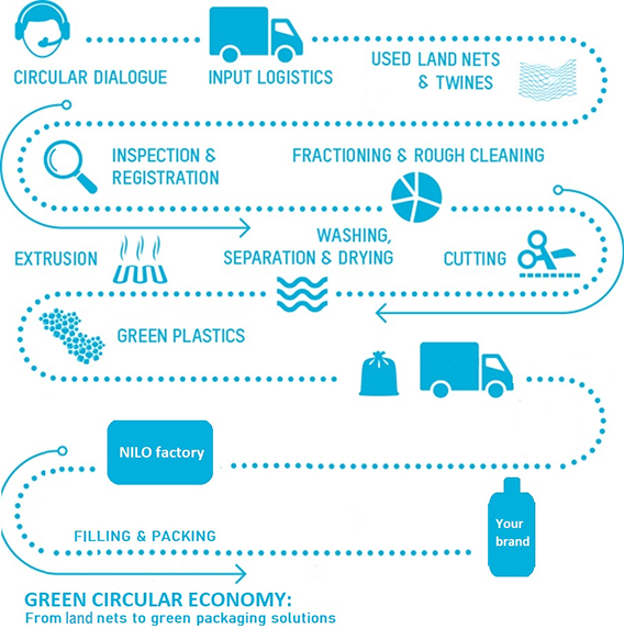 Ακολουθείται μία κυκλική διαδικασία για την παραγωγή του Πράσινου Πλαστικού, όπου τα χρησιμοποιημένα αλιευτικά δίχτυα, τράτες και σχοινιά συλλέγονται, πλένονται, ταξινομούνται και μετασχηματίζονται σε α’ ύλη υψηλής ποιότητας σε μορφή κόκκων. Στη συνέχεια, το Πράσινο Πλαστικό μετασχηματίζεται σε συσκευασίες προϊόντων, φιλικές προς το περιβάλλον.